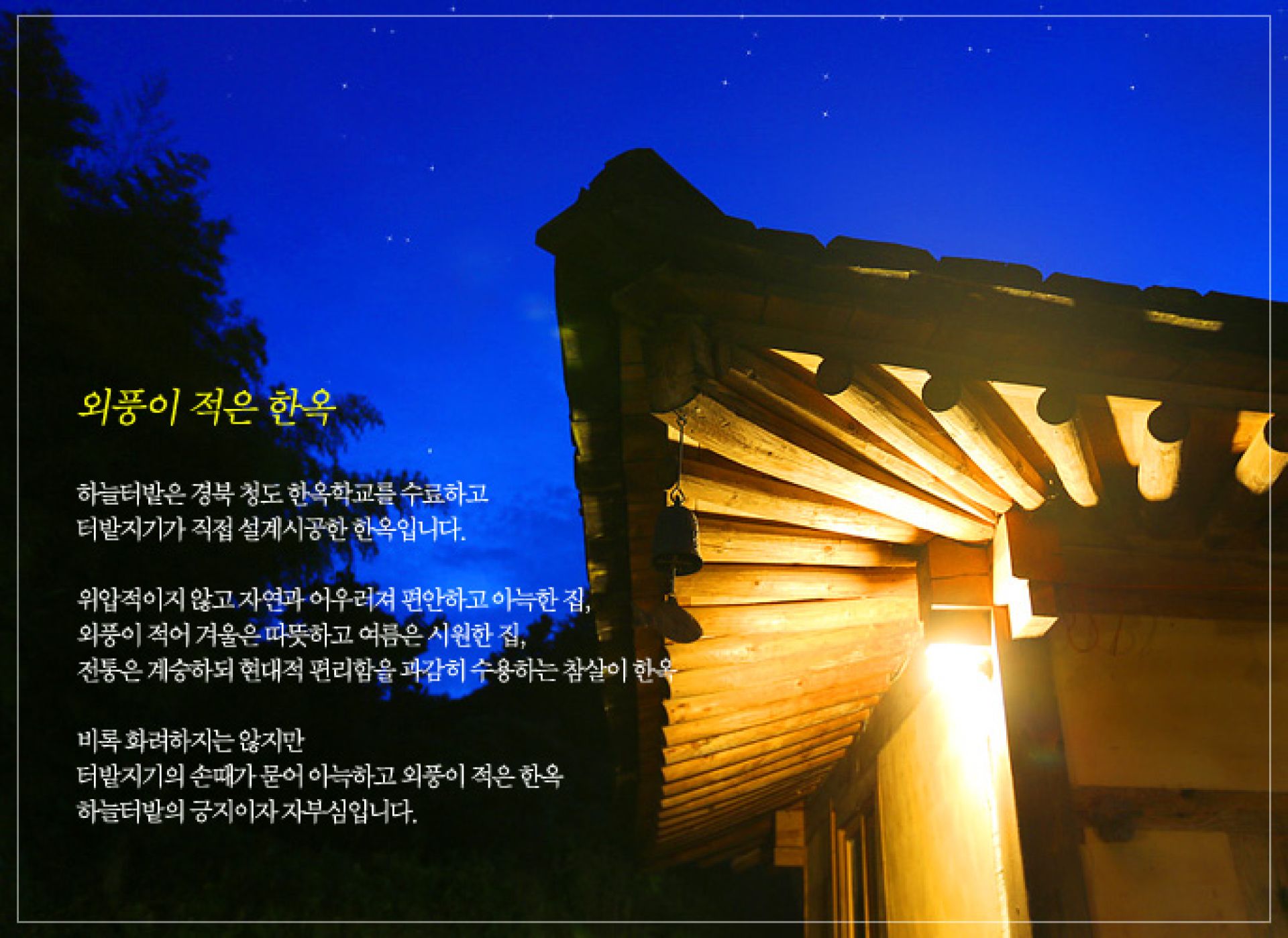 하늘터밭은 경북 청도 한옥학교를 수료하고 터밭지기가 직접 설계시공한 한옥입니다.